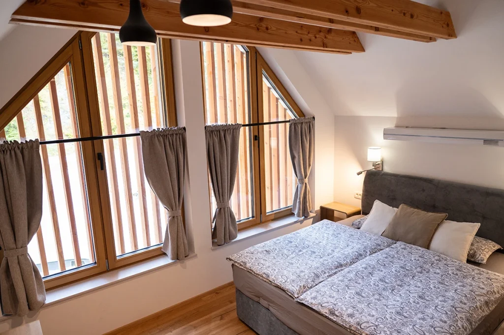 V Hiši Plesnik vas pričakajo svetle, sodobno opremljene sobe, grajene iz naravnih materialov in kakovostnega hrastovega lesa. Tla iz vrhunskega kmečkega poda EUROWOOD dodajo toplino in domačnost, premišljena razsvetljava pa ustvari sproščen ambient.